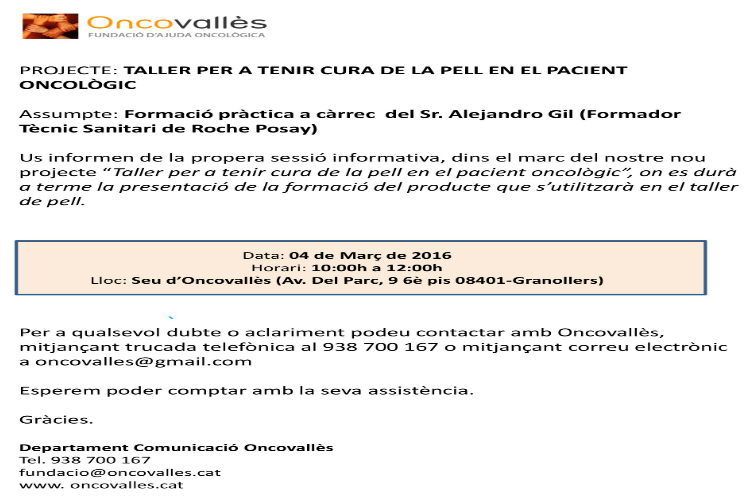Portada > Agenda > TALLER PER TENIR CURA DE LA PELL EN EL PACIENT ONCOLÒGIC