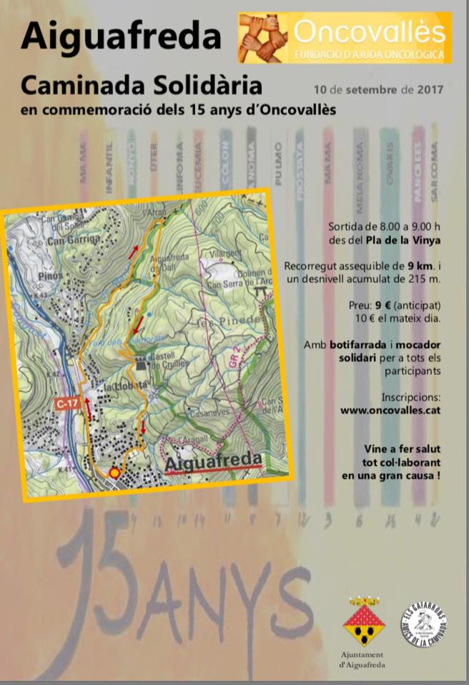 L'Ajuntament d'Aiguafreda ha organitzat una caminada per celebrar els 15 anys d'Oncovallès. Compartirem un matí feliç i farem exercici amb un poble solidari!!!